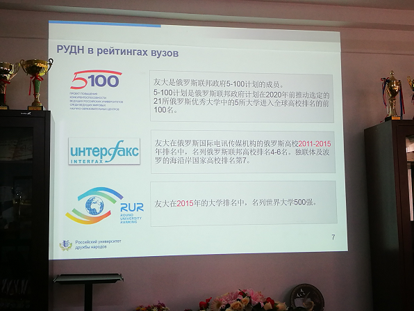 俄罗斯人民友谊大学国际处处长介绍了俄罗斯人民友谊大学的学科建设情况,英文硕士生项目及暑期成人在线,同时也介绍了该校的基本数据、成人在线文化及留学生住宿及餐饮情况。赵志毅副院长对来宾表示了欢迎并介绍了我院的基本情况以及参与俄罗斯高校暑期成人在线及硕士生项目开展情况。李欣欣老师就即将有可能开展的合作项目及相关问题与来宾进行了洽谈。