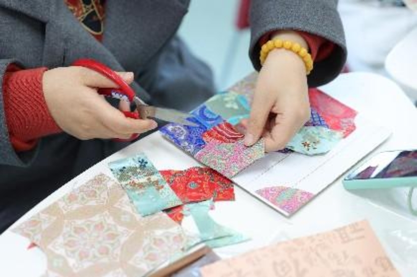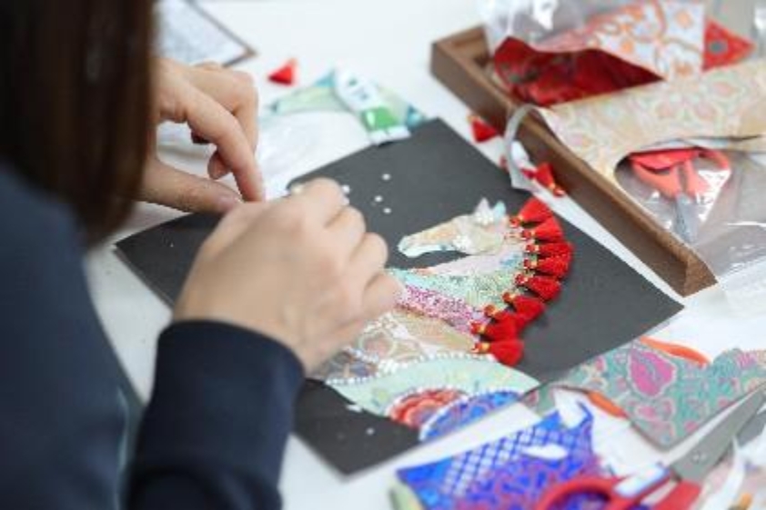 在制作环节,大家全神贯注、各展巧思。从挑选色彩斑斓的宋锦面料,到精心裁剪、拼贴出 “福” 字、葫芦、骏马等寓意吉祥的图案轮廓;从细致地粘贴珍珠作为点缀,到耐心地调整每一块锦缎的位置与角度,每一步都凝聚着匠心与巧思。